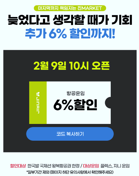 - 만약 2월 9일 10시에 진에어 슈퍼로우 혜택을 놓쳤을 경우에는 6% 할인쿠폰을 다운받으세요!