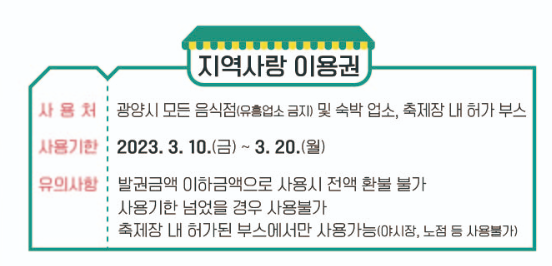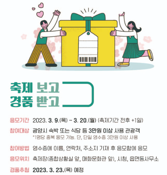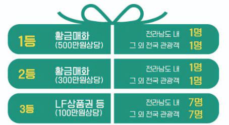 광양시 내에서 식당을 이용하거나 숙박을 하여 3만원 이상 관광객이 영수증에 이름과 연락처, 주소를 기재해 응모하면 된다고 합니다. 경품 추첨자 발표는 2023년 3월 23일(목)에 YouTube 라이브방송에서 추첨한다고 하니 다들 행운이 함께하시기를 바라겠습니다!